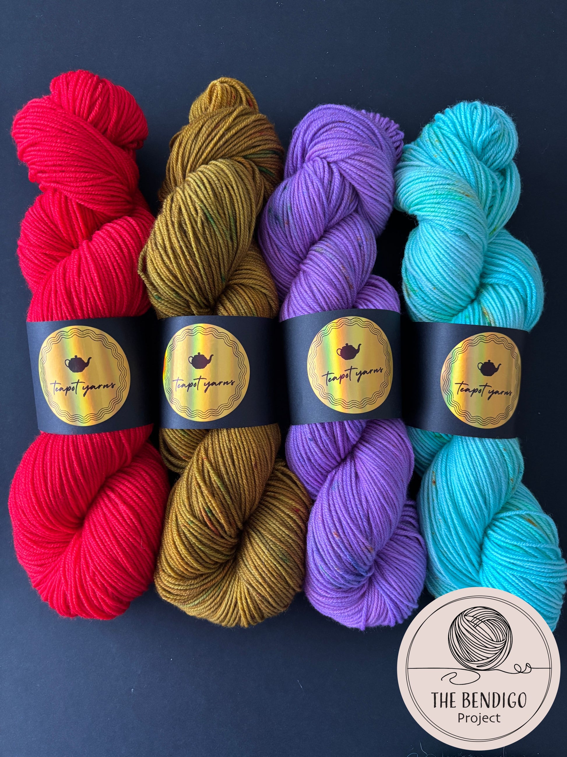 - One 100g skein of Bendigo Red and one 100g skein of Bendigo Gold